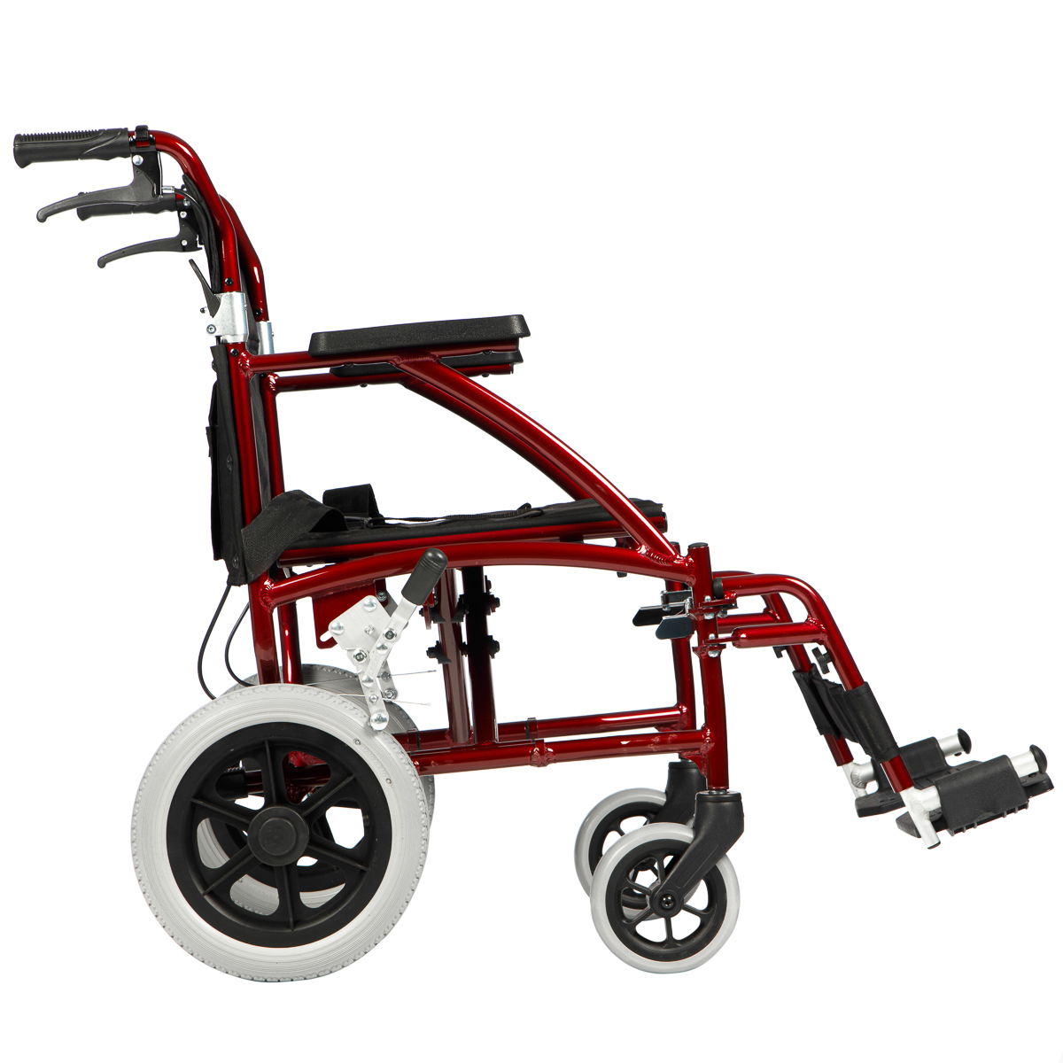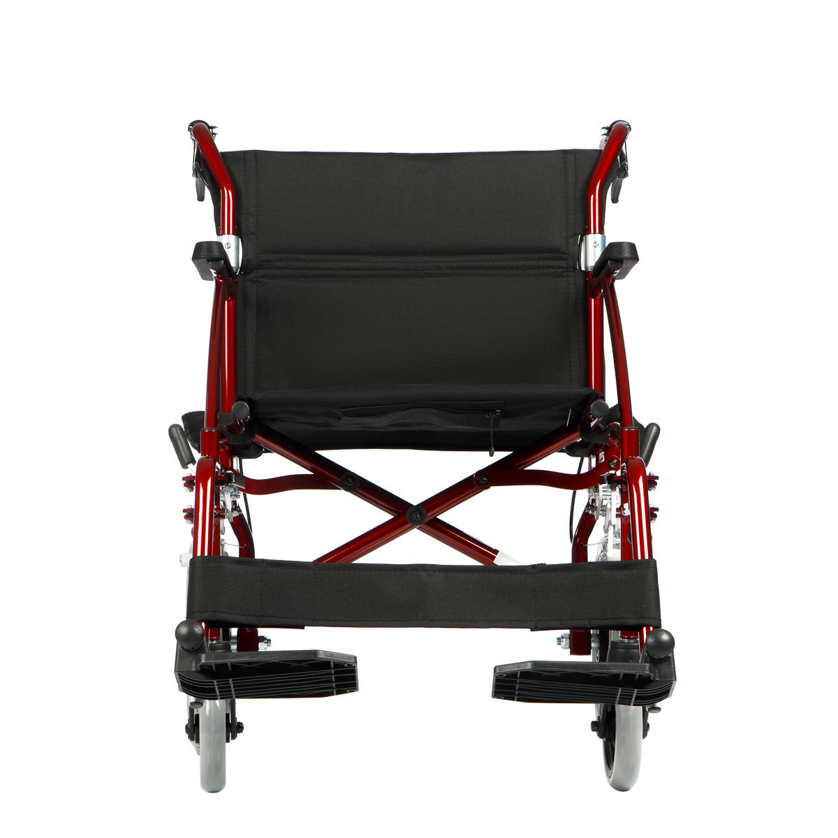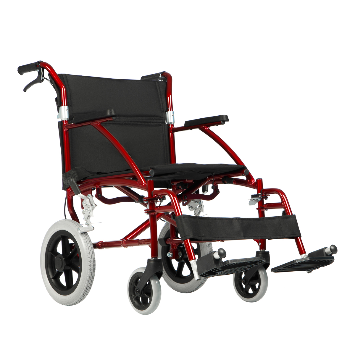 прочное стальное инвалидное кресло-коляска с удлиненной спинкой и мягкими удобными подножками.