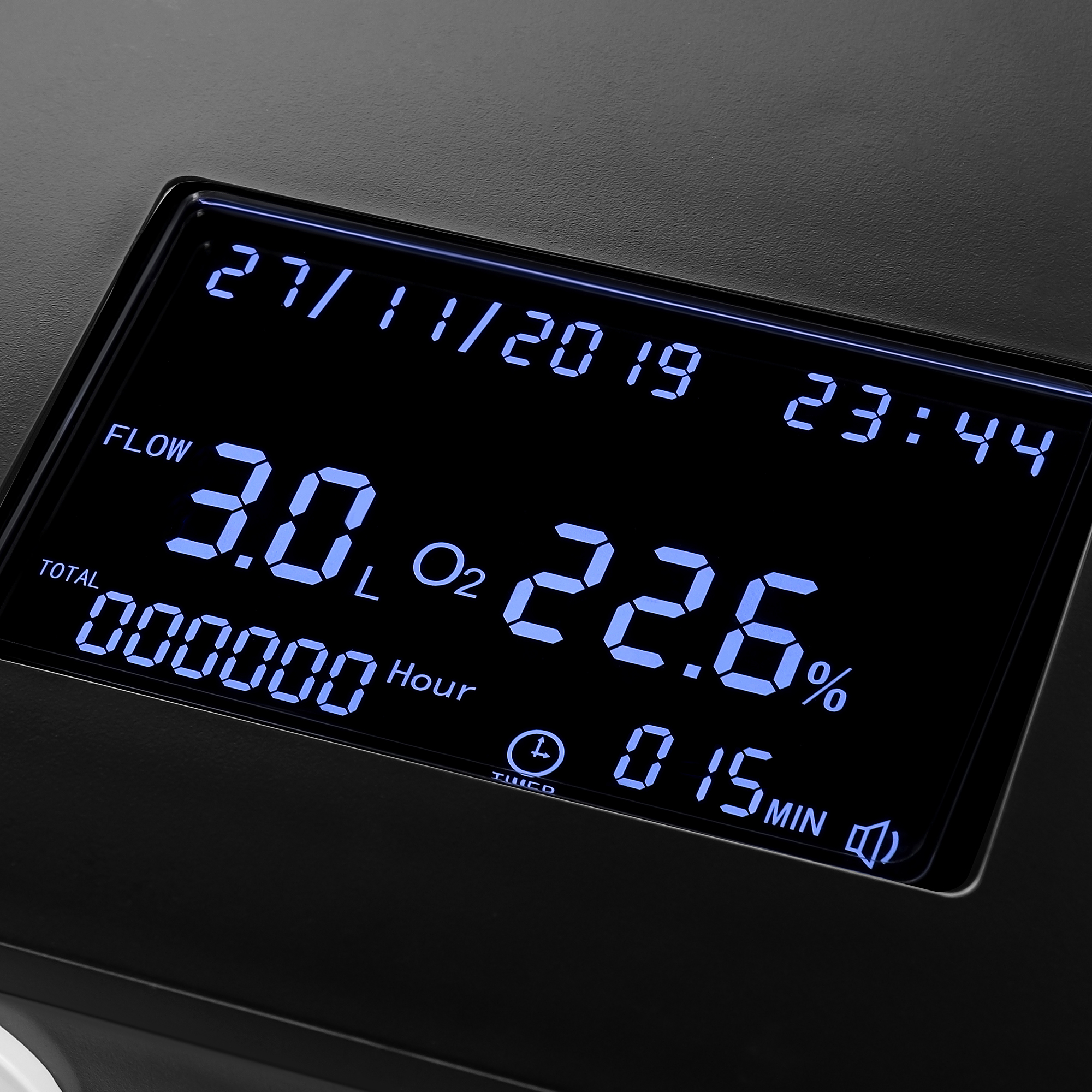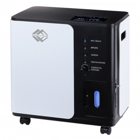 Благодаря методу разделения газов путем прохождения воздушного потока через систему фильтрации, пациент на выходе получает смесь с высокой концентрацией чистого кислорода – до 92%. Скорость потока возможна от 0,5 до 3 литров в минуту без потери уровня кислородной концентрации. Важной особенностью концентратора является низкий уровень шума (не более 60 дБ) и практически полное отсутствие вибрации, что позволяет использовать аппарат и в ночное время суток без нарушения покоя пациентов. Устройство не требует частого и сложного обслуживания – достаточно своевременной замены фильтров и воды в увлажнителе. Все детали, требующие ухода, являются быстросъемными. Увлажнитель концентратора оснащен шкалой для контроля уровня воды и приятной для глаза подсветкой. Удобно расположенные кнопки управления на корпусе также подсвечиваются, их эргономичное расположение значительно упрощает настройку устройства. Жидкокристаллический крупный дисплей на верхней части корпуса отображает всю необходимую информацию крупными легко читаемыми символами.