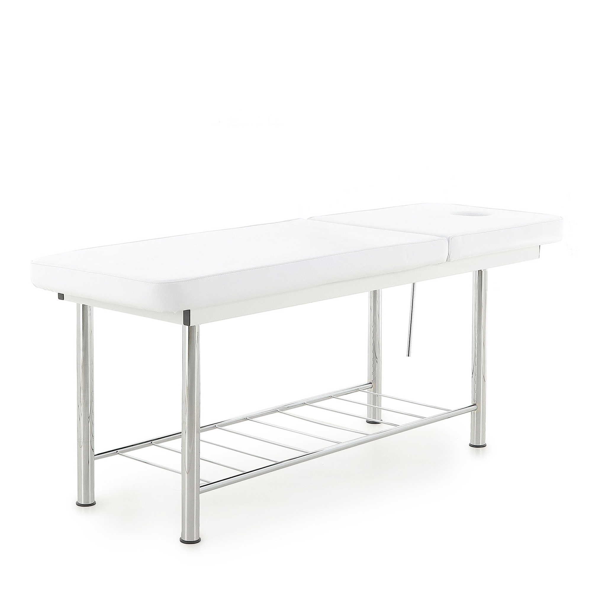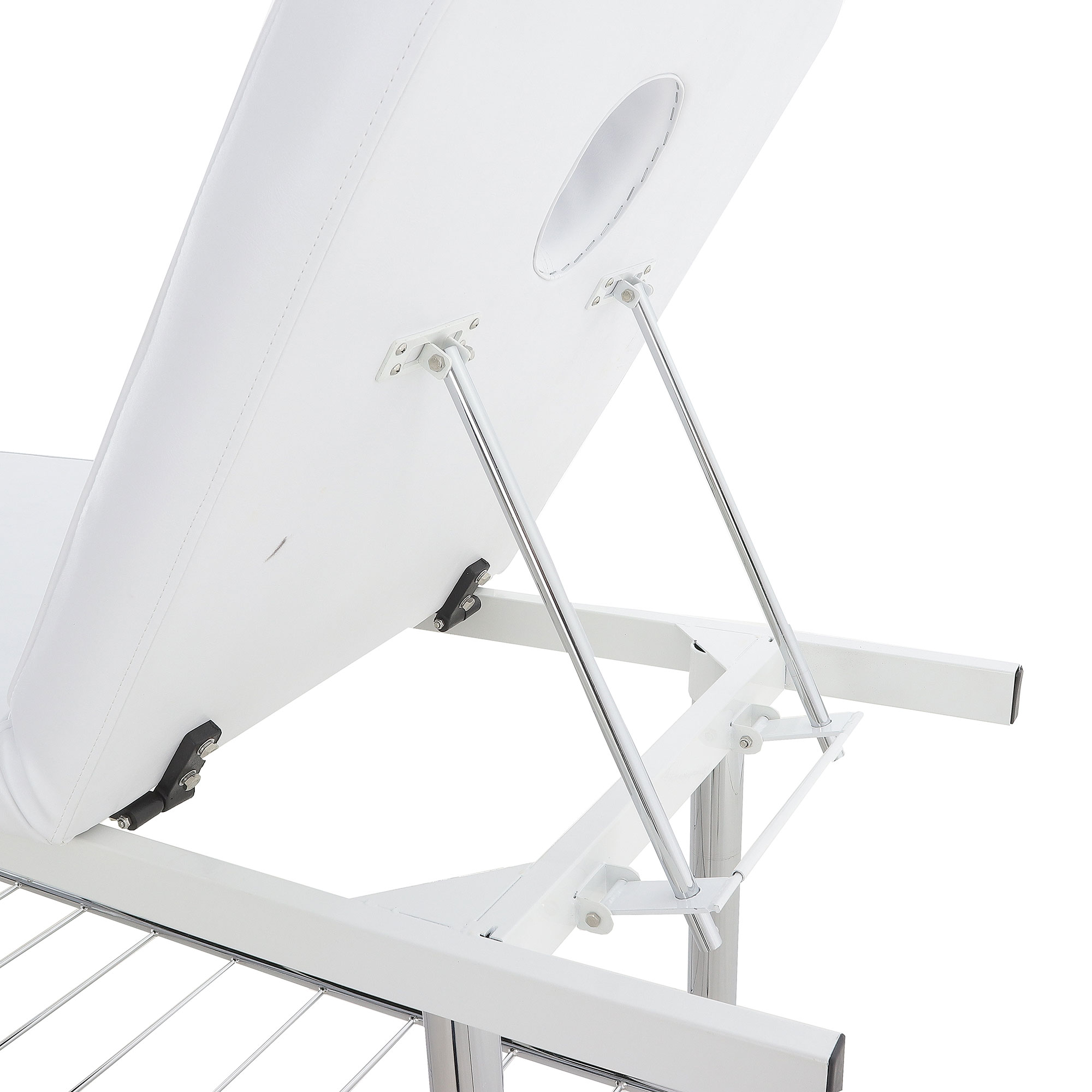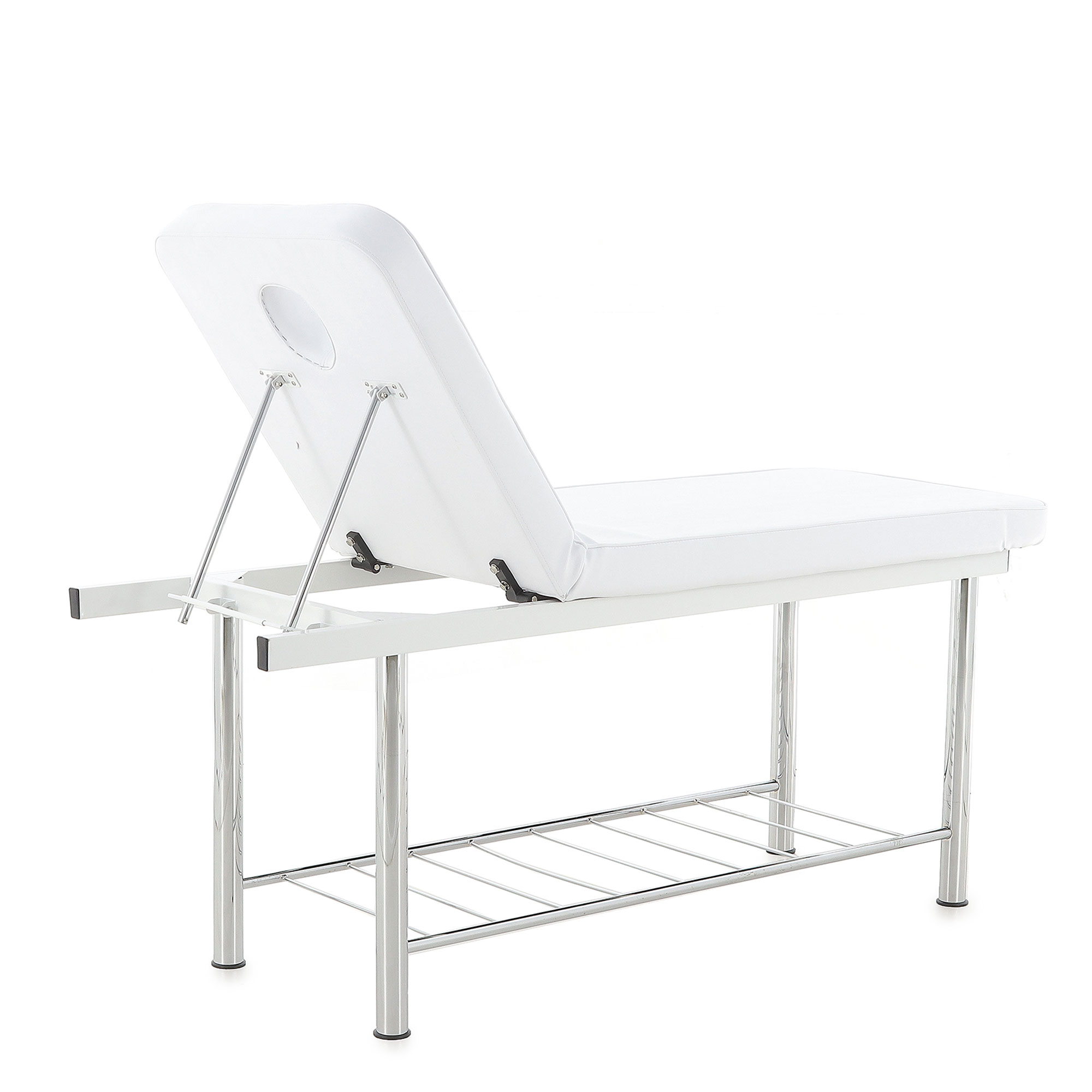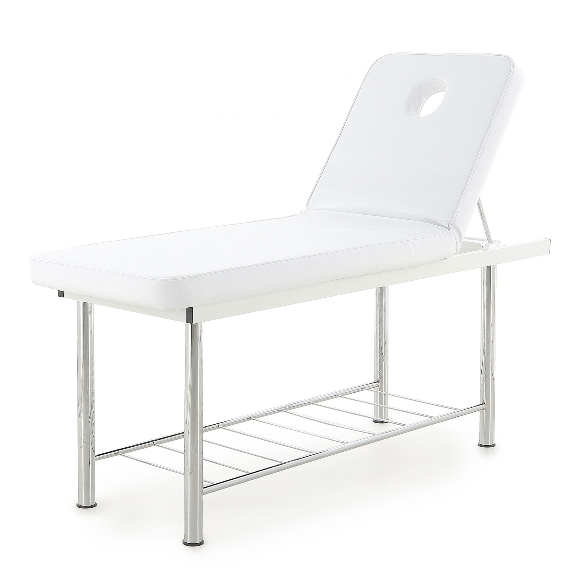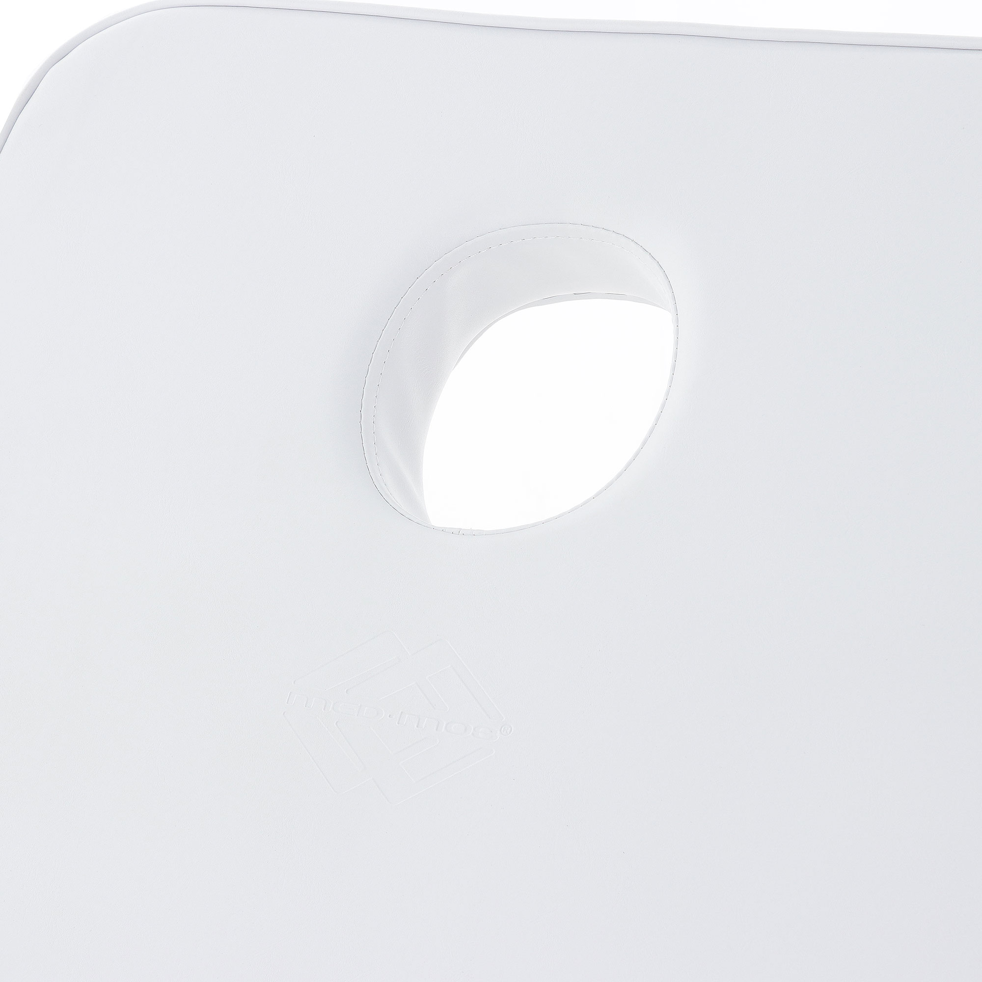 Односекционный ложемент с отдельным вырезом для лица обтянут высококачественным винил-люксом, стойким к истиранию и механическим повреждениям. Под ним находится слой упругого поролона толщиной 5 см, создающего оптимальную жесткость ложа для принятия процедур. Белый цвет виниловой обивки пусть вас не смущает — трудностей при уходе за ним этот факт не создаст.