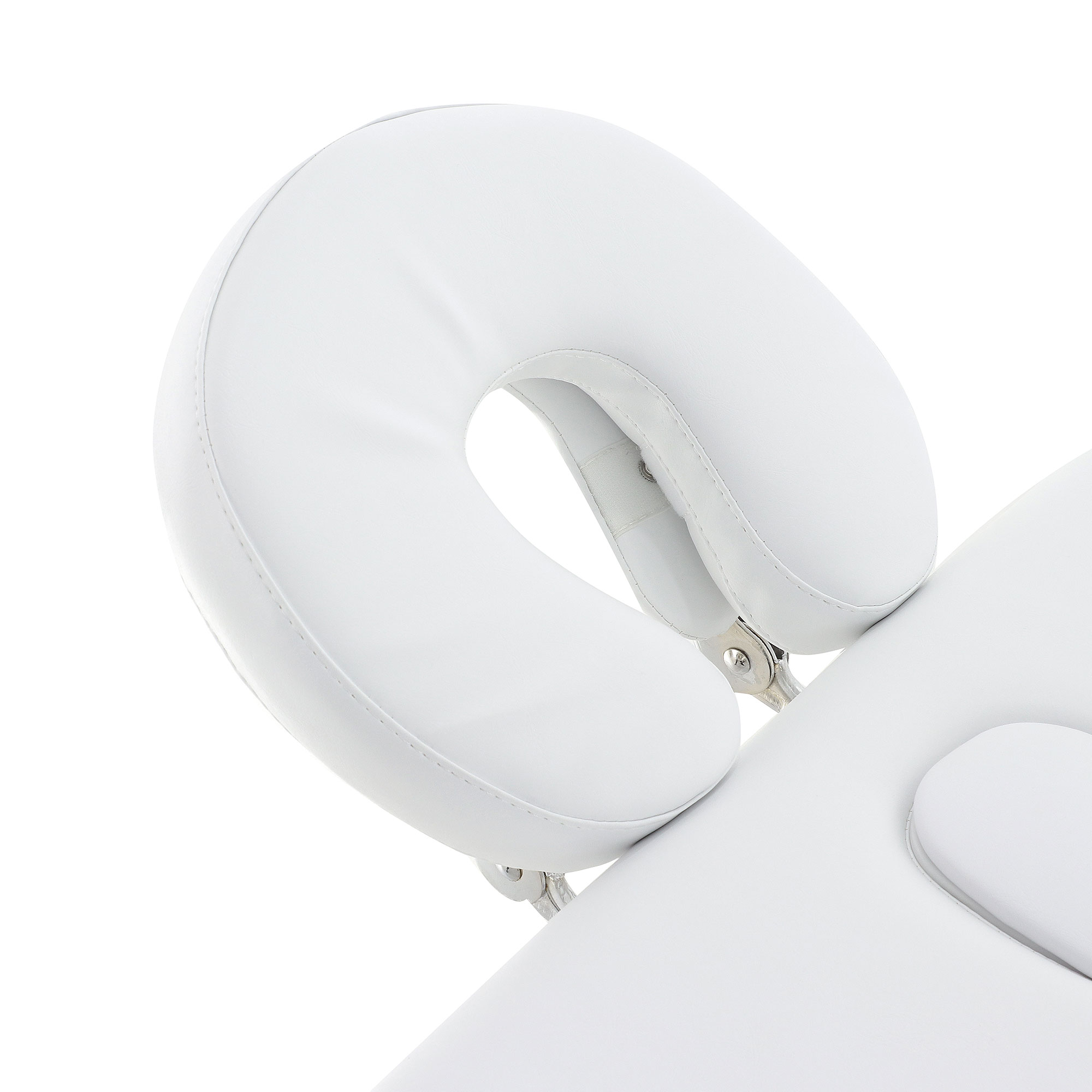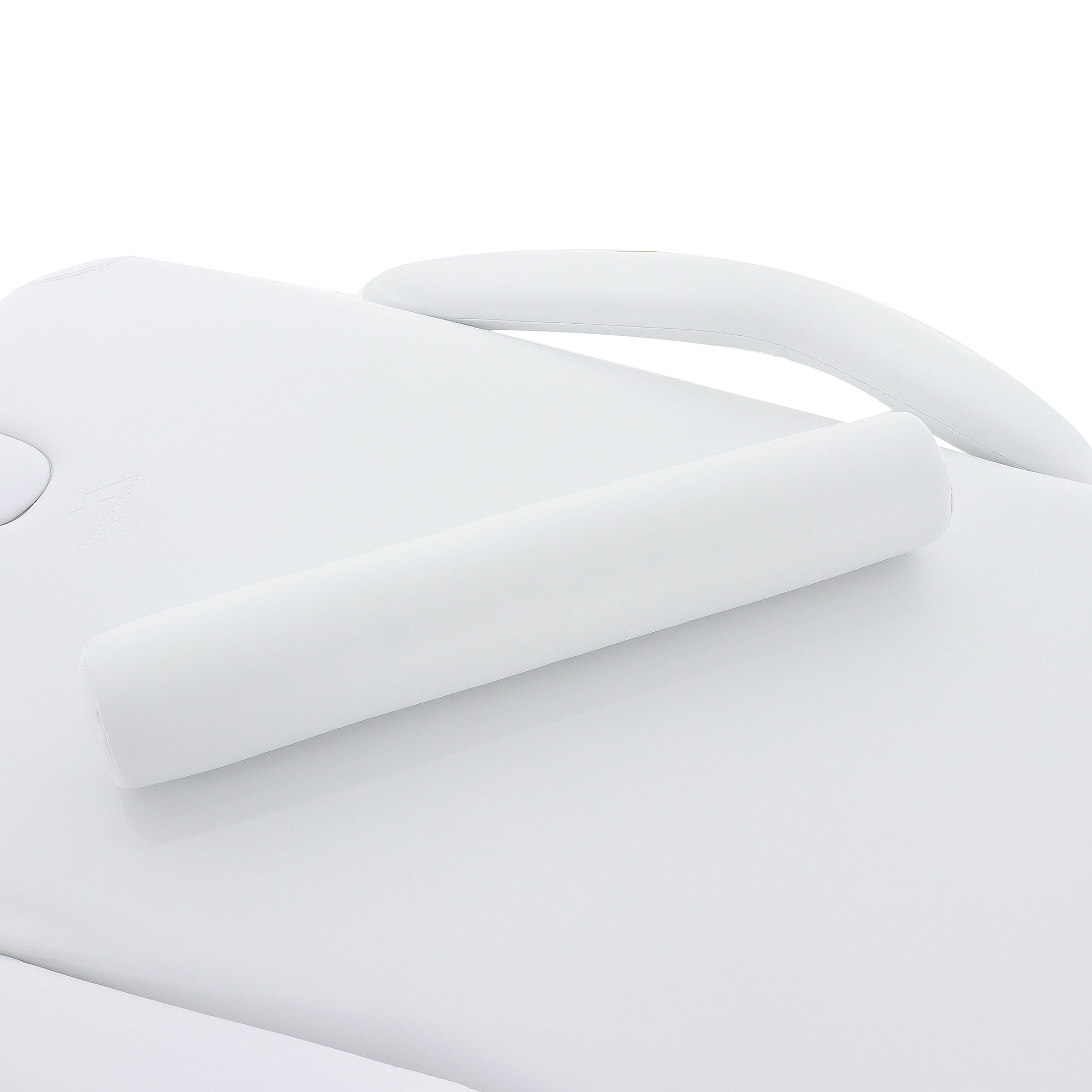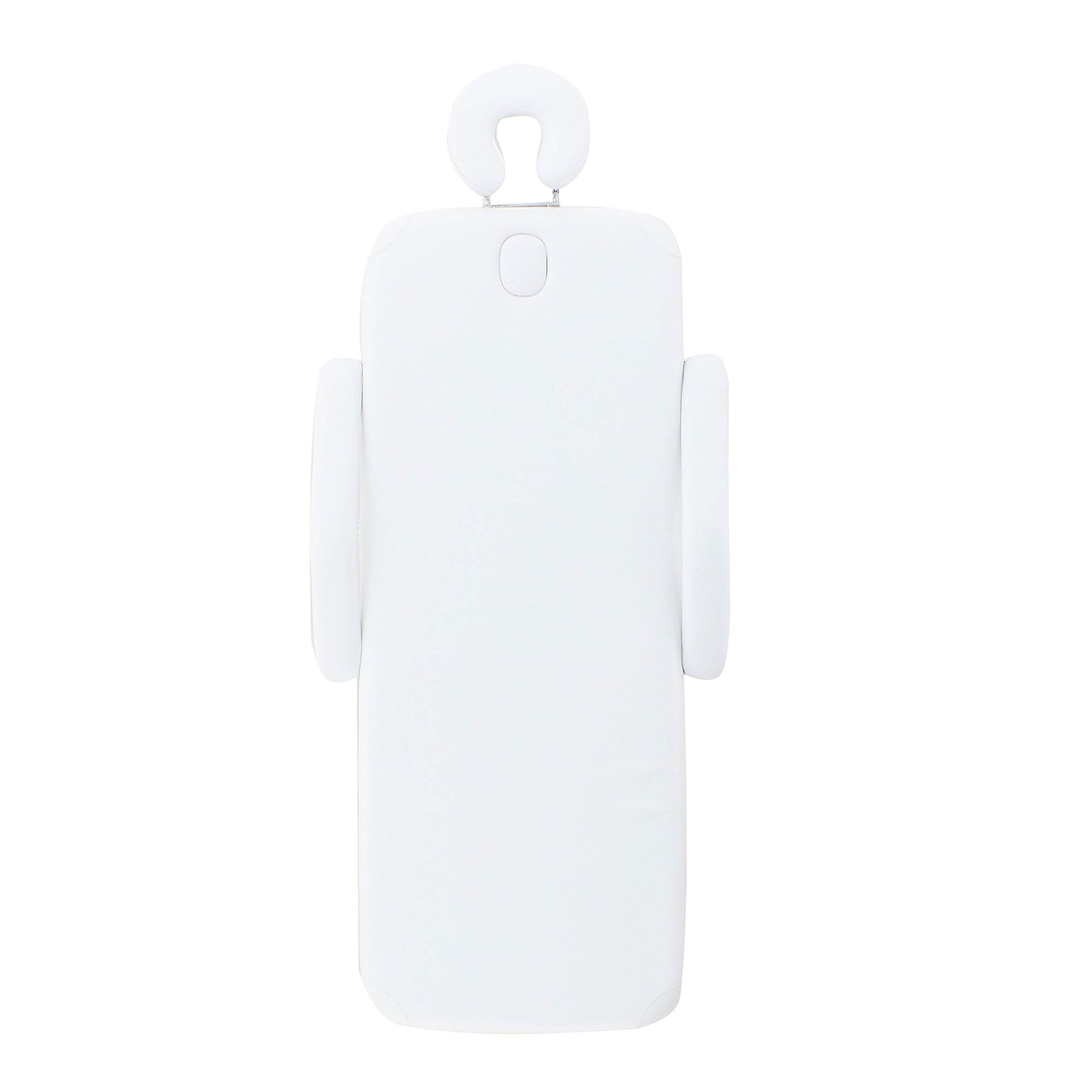 Каркас стола выполнен из стального сплава. Этот материал не подвержен коррозии, не портится от попадания влаги, не деформируется. В качестве наполнителя используется поролон толщиной 120 мм. Он не проминается, хорошо сохраняет свою форму и оказывает должную поддержку. Обивкой служит винил-люкс. Этот материал отличается высоким качеством. Он не протирается и не трескается, не портится от попадания влаги и косметических средств. Кроме того, он приятен на ощупь, не вызывает тактильного дискомфорта или аллергии. В комплекте есть не только подголовник, но также и валик под ноги.