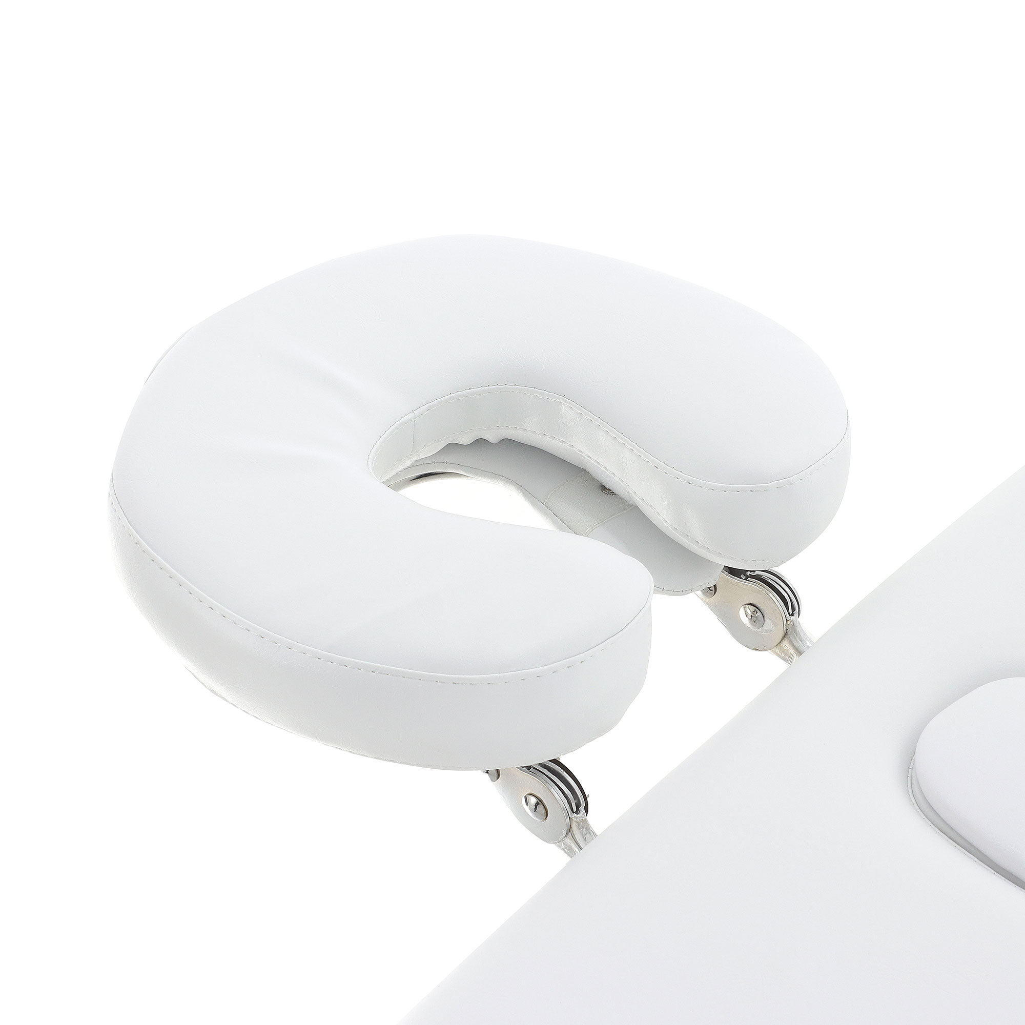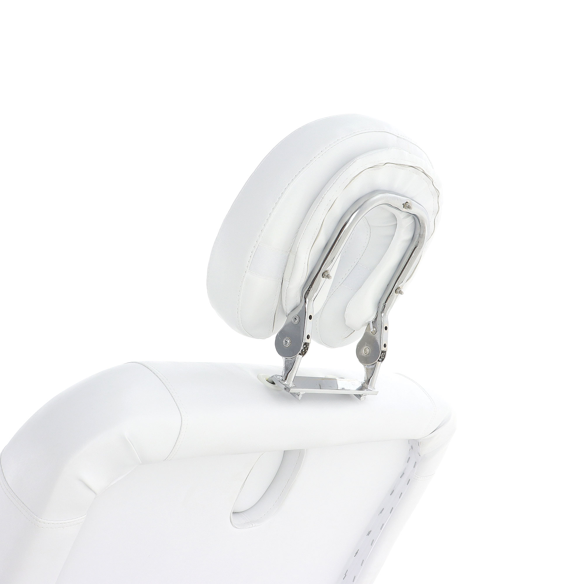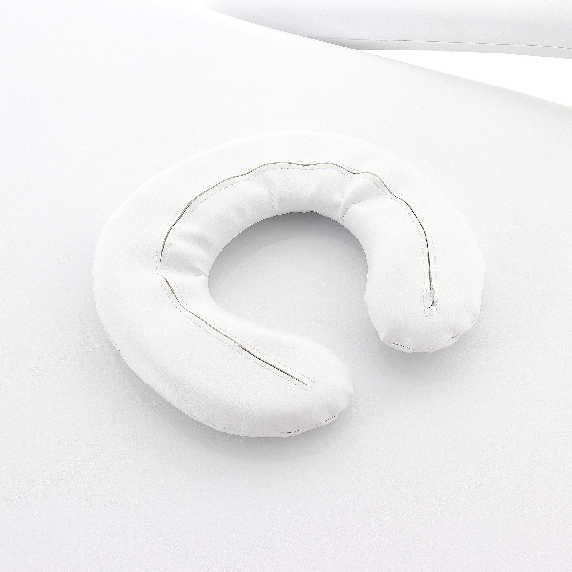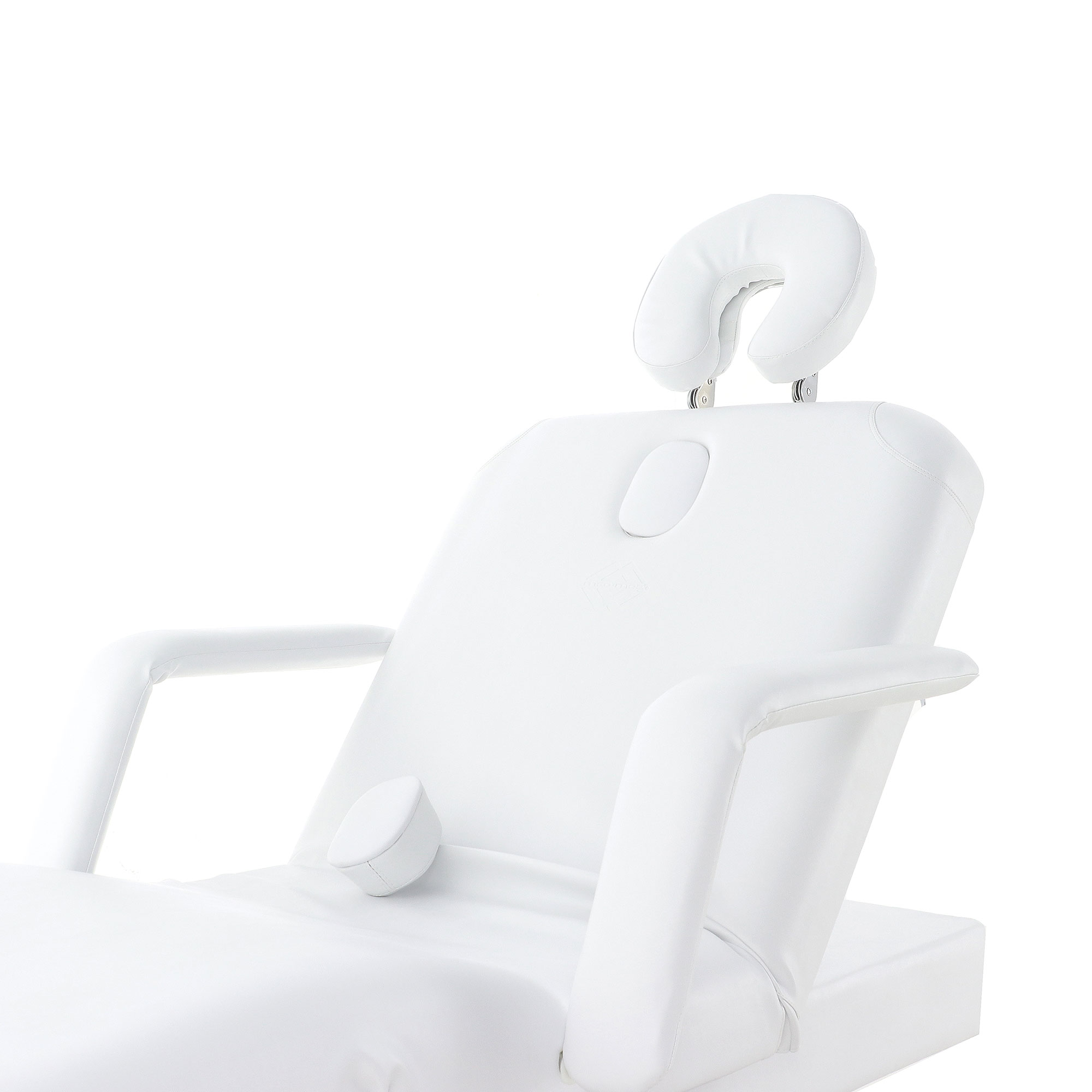 Каркас стола выполнен из стального сплава. Этот материал не подвержен коррозии, не портится от попадания влаги, не деформируется. В качестве наполнителя используется поролон толщиной 120 мм. Он не проминается, хорошо сохраняет свою форму и оказывает должную поддержку. Обивкой служит винил-люкс. Этот материал отличается высоким качеством. Он не протирается и не трескается, не портится от попадания влаги и косметических средств. Кроме того, он приятен на ощупь, не вызывает тактильного дискомфорта или аллергии. В комплекте есть не только подголовник, но также и валик под ноги.
